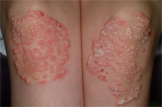 Tổn thương dát đỏ bong vảy mỏng, ranh giới rõ tập trung thành mảng vùng đầu gối ở trẻ 5 tuối.