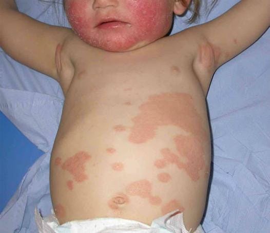 - Vảy nến khi da toàn thân bị đỏ nghiêm trọng, bao phủ hầu hết hoặc toàn bộ cơ thể của trẻ.