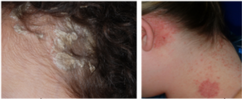 Tổn thương dát đỏ, bong vảy trắng vùng đầu, rìa tóc và sau gáy ở trẻ 10 tuổi.