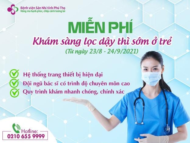 Mong muốn con cái có quá trình phát triển bình thường như các bạn bè đồng trang lứa là nhu cầu tâm lý bình thường của các bậc cha mẹ. Thấu hiểu những mong muốn đó, Bệnh viện Sản Nhi tỉnh Phú Thọ tổ chức chương trình Miễn phí công khám và tư vấn cho khách hàng đăng ký khám sàng lọc cho trẻ nghi ngờ hoặc có dấu hiệu dậy thì sớm tại Phòng khám 215 - khoa Khám và điều trị ngoại trú của Bệnh viện.