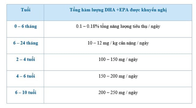 Trẻ em (bao gồm trẻ sơ sinh và trẻ nhỏ dưới 10 tuổi) cần được bổ sung thêm Omega 3 ở dạng DHA và EPA với hàm lượng được khuyến nghị như sau: